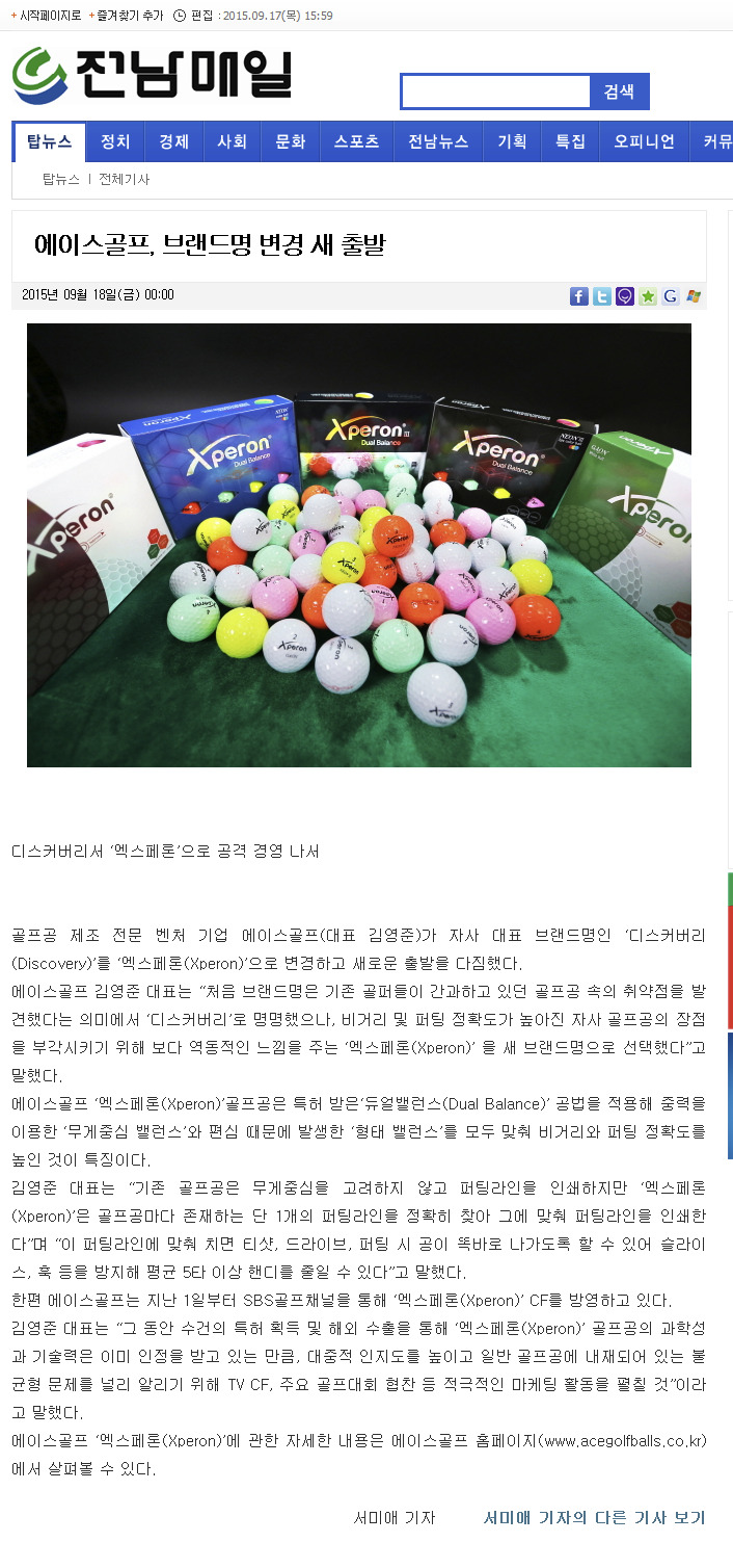 전남매일 -에이스골프,브랜드명변경 새 출발